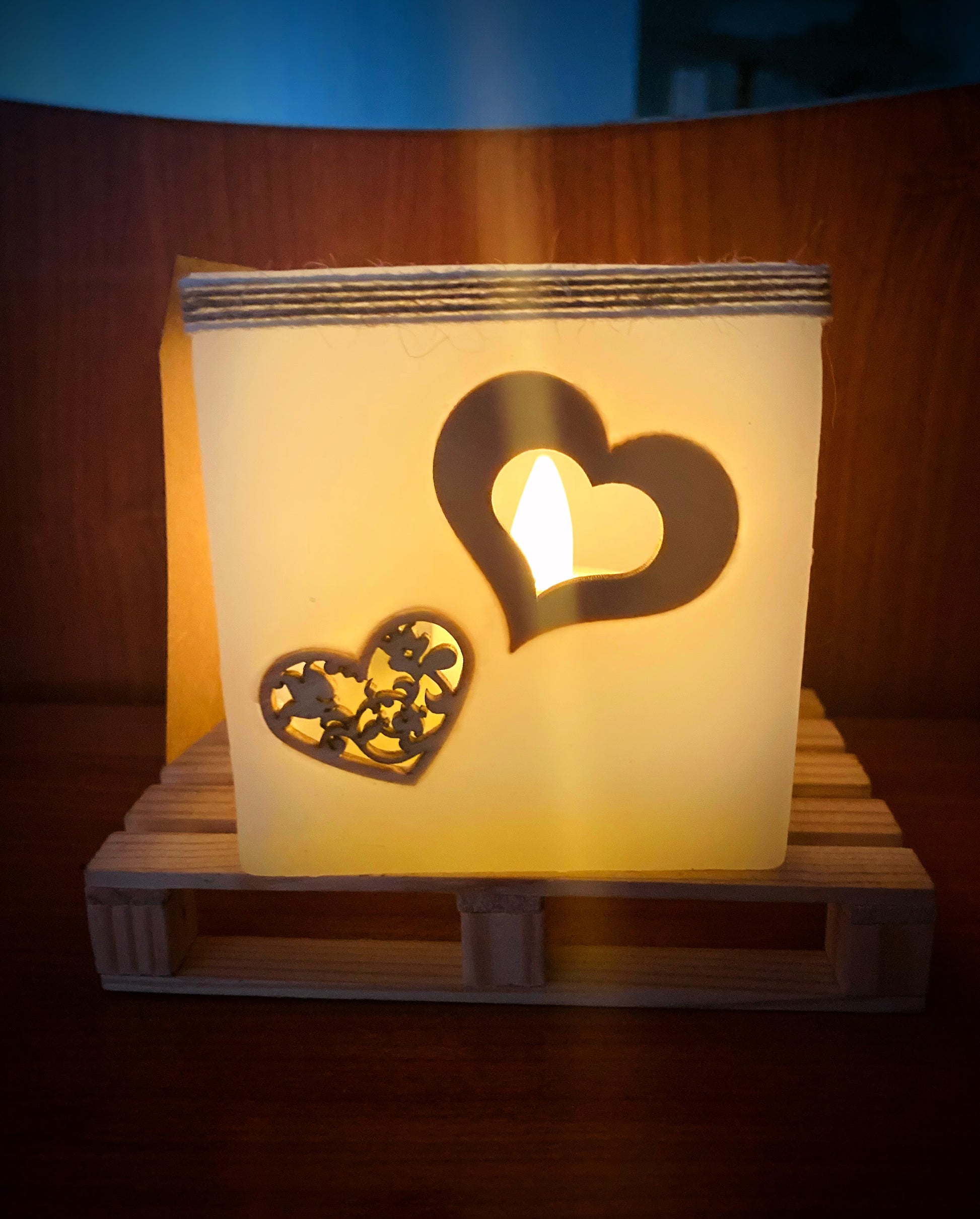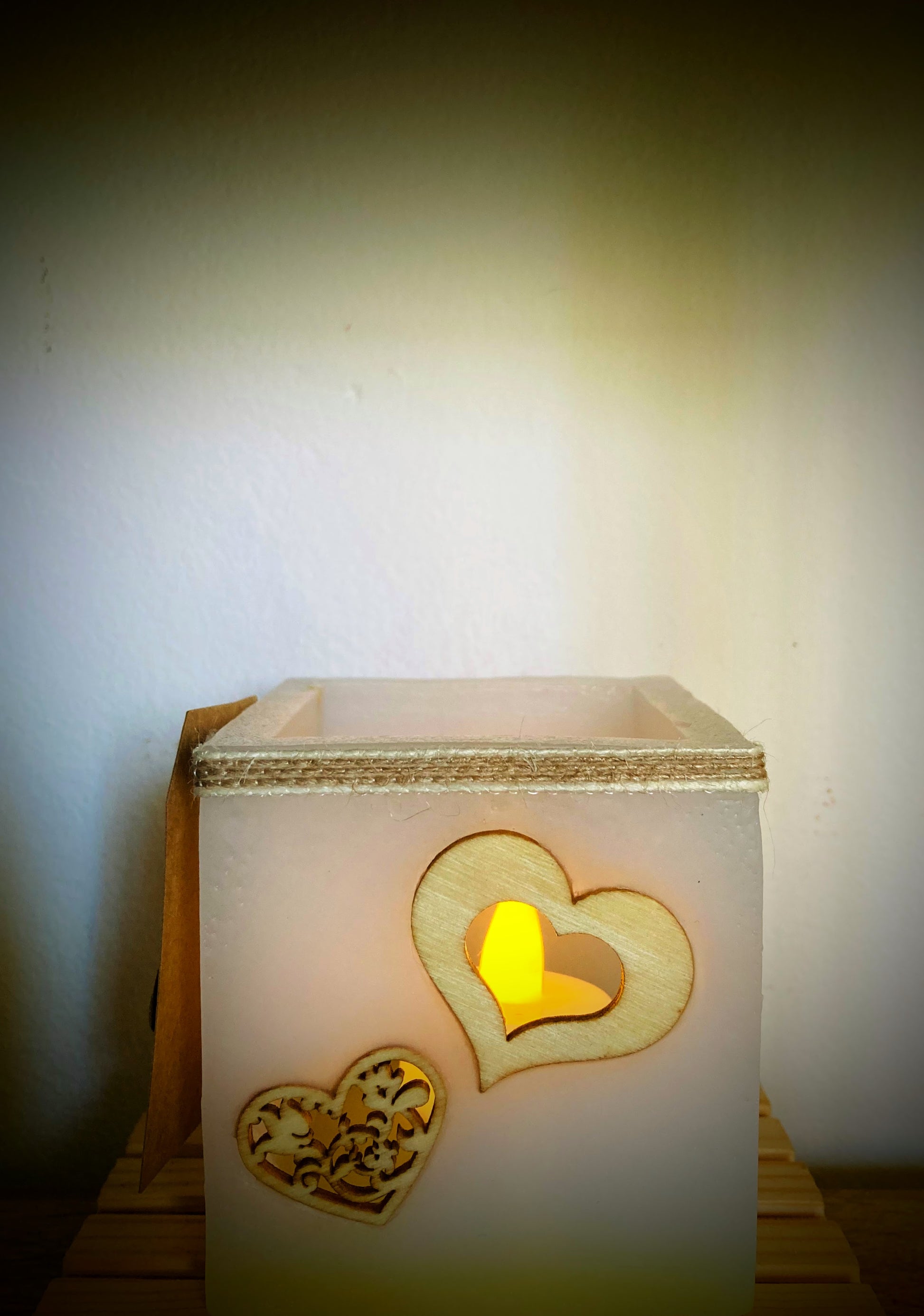 Fanal artesanal / vela hueca - Lilinnight con apliques de madera en forma de corazón —