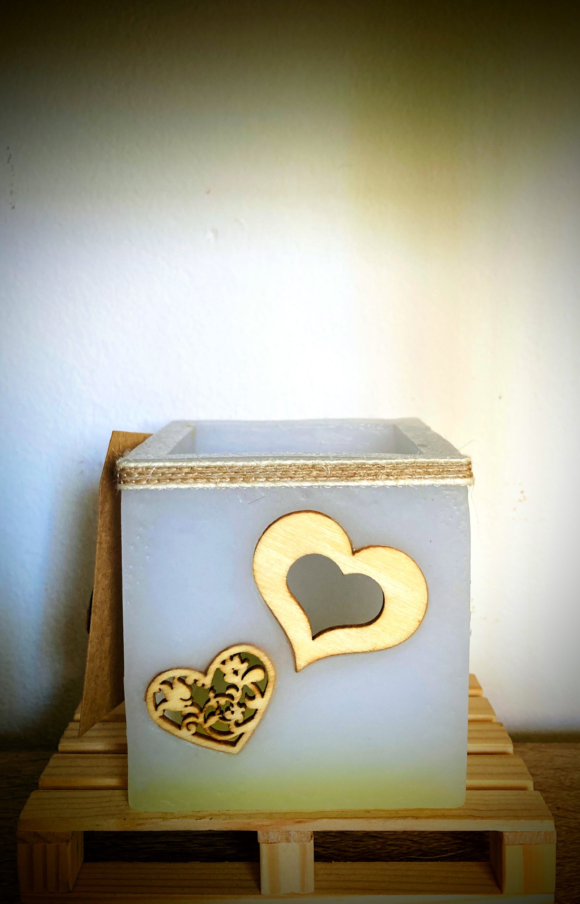 Presentamos este fanal artesanal de cera hecho a mano por Lilinnight, con delicados apliques de madera en forma de corazón que le aportan un toque romántico y natural.