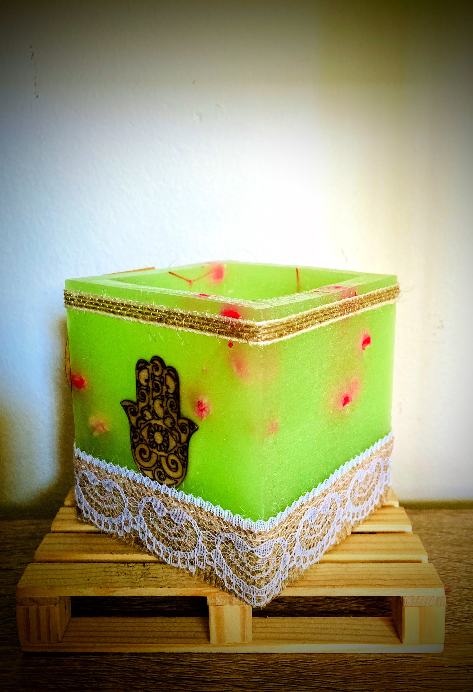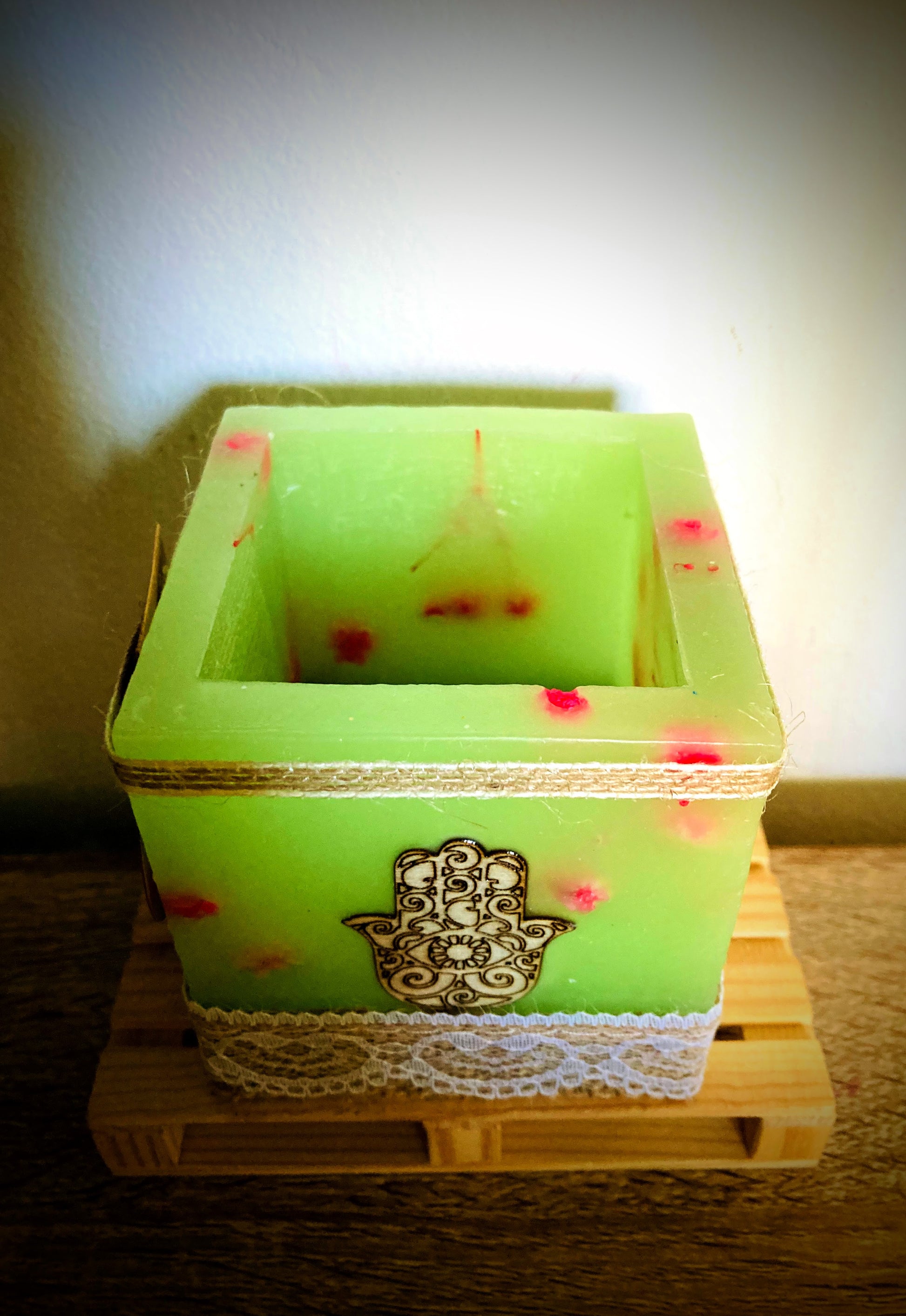 Este hermoso fanal de cera hueca, de la marca Lilinnight, es un producto artesanal de diseño único y encantador. Está disponible en varios colores (puedes pedirnos el color y olor mediante mensaje directo por la página), está decorado con un aplique central de madera en forma de la Mano de Fátima finamente detallada. En el interior, incorpora flores secas que resaltan con elegancia cuando se iluminan desde dentro. El borde superior está adornado con un cordón de yute natural, y la base incluye una banda decorativa. Este fanal destaca por su iluminación cálida cuando se utiliza con una fuente de luz, proyectando las texturas de las flores en su interior y la belleza del aplique de madera. Su fragancia y diseño único lo convierten en un regalo perfecto o un detalle decorativo para cualquier espacio.