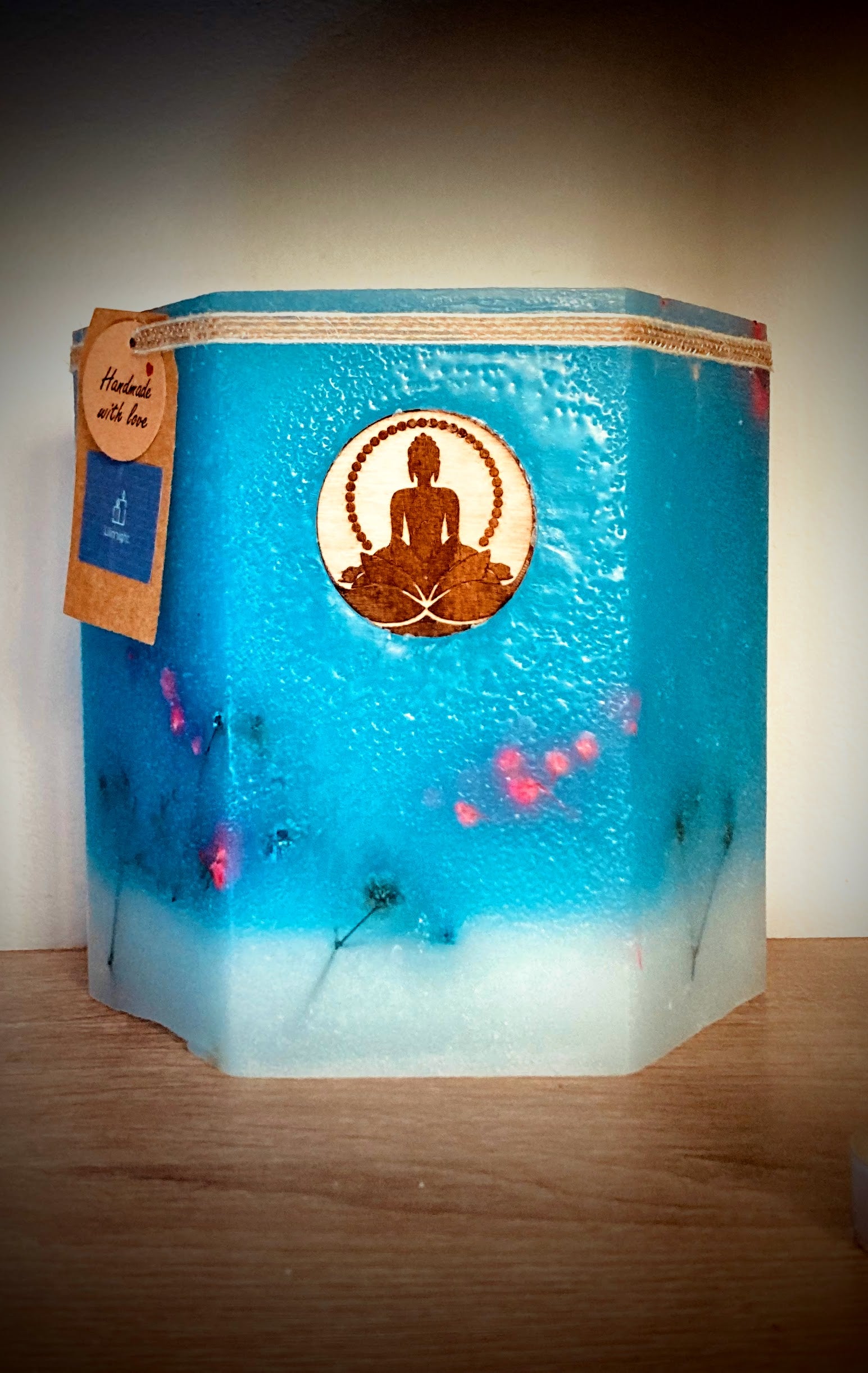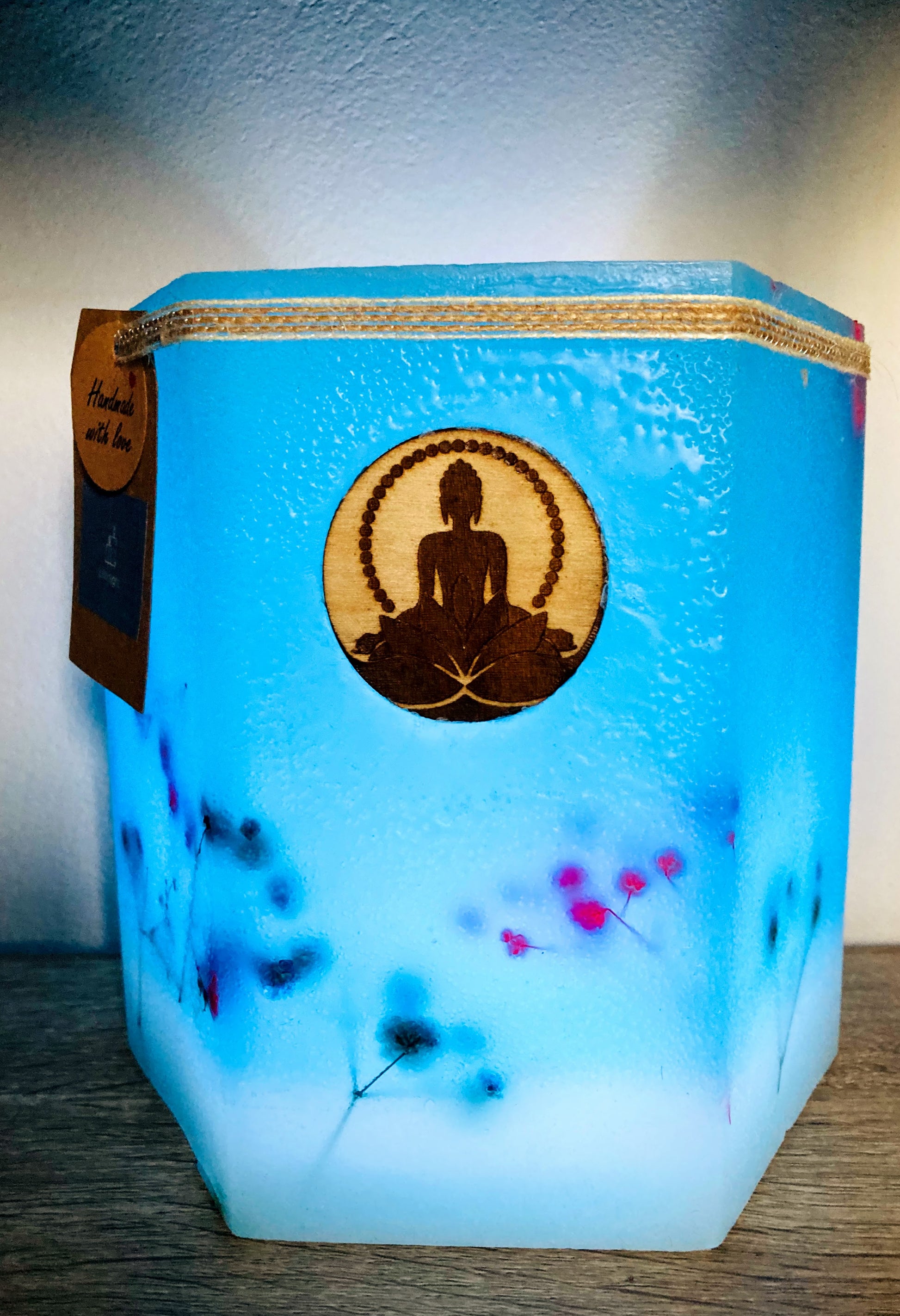 - Dimensiones: 14x14 cm, diseño hexagonal. Peso: Aproximadamente 700 gramos. Color: Azul cielo. Aroma: Fragancia floral suave. Decoración: Flores secas en el interior y aplique de madera con diseño de Buda. Incluye: Luz LED para un uso seguro y cómodo. Material: Cera especial para fanales, resistente y duradera