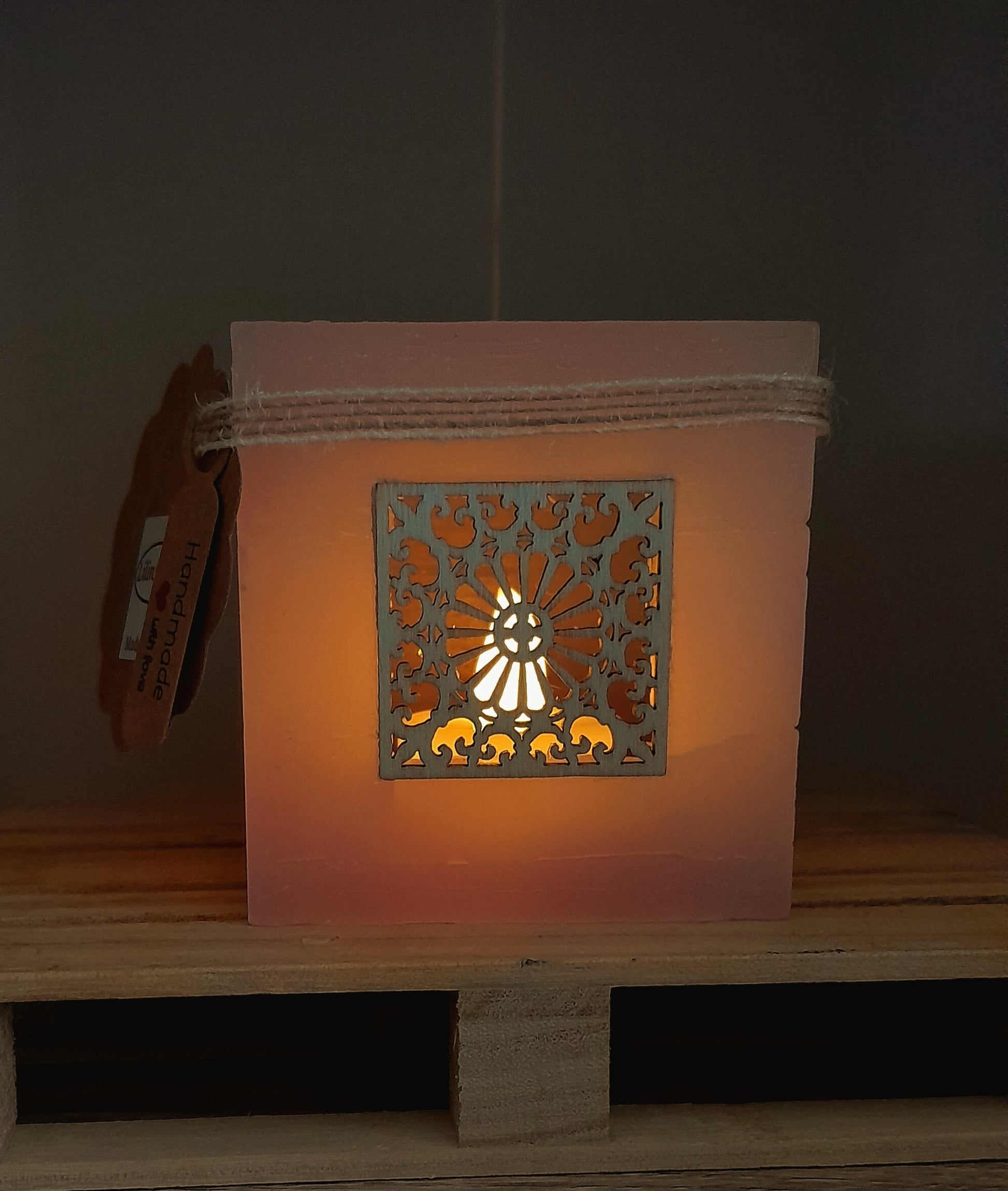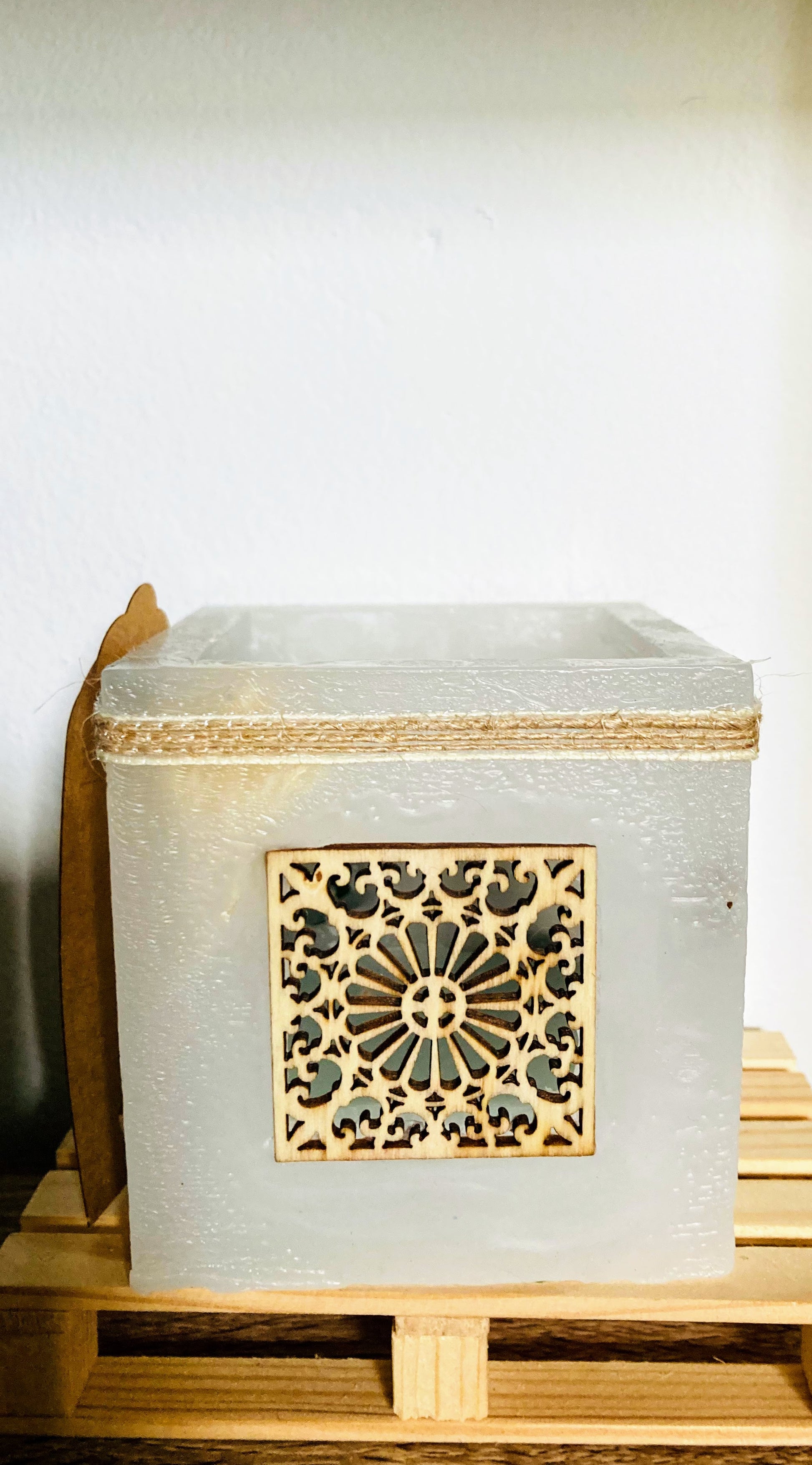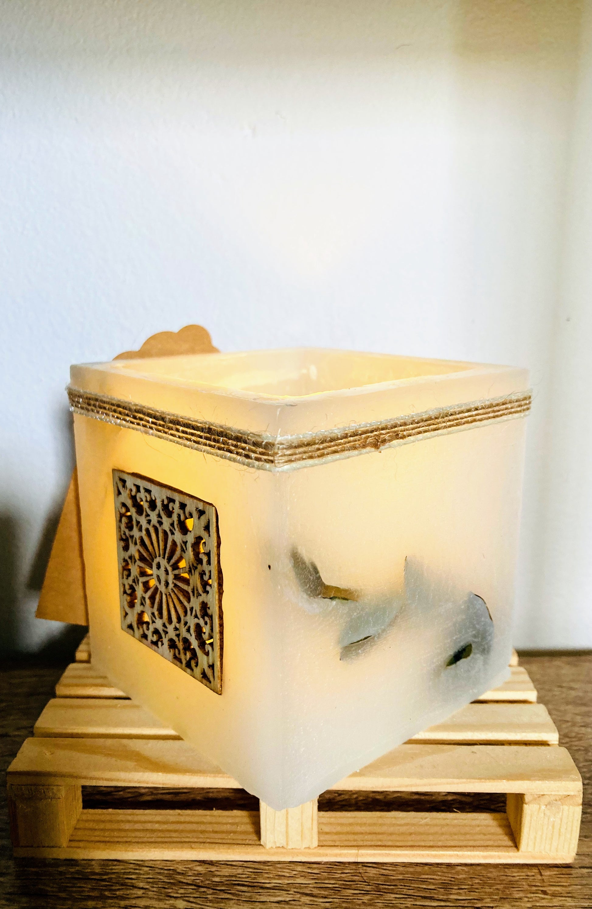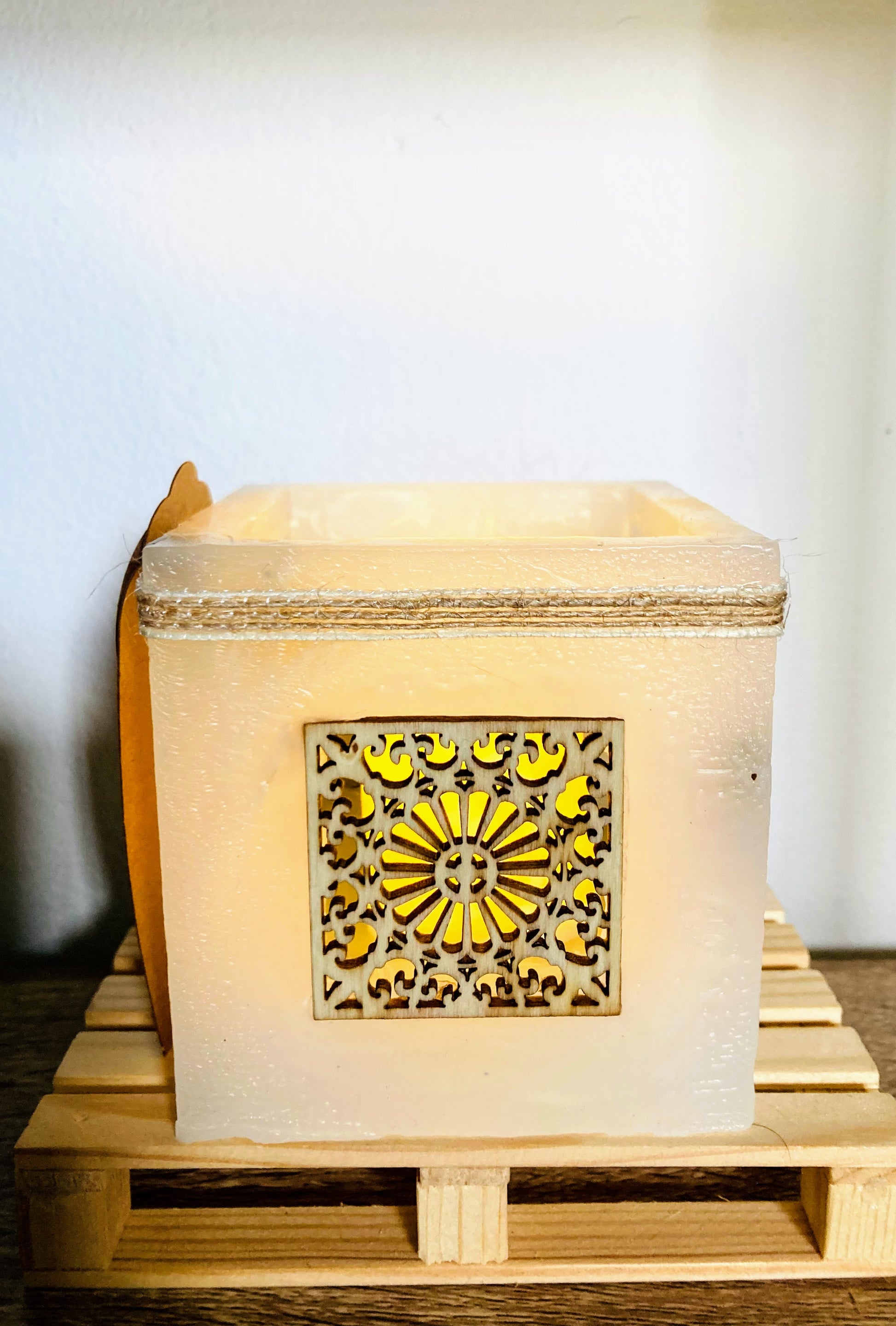 Este fanal de cera artesanal de Lilinnight es la combinación perfecta de decoración y calidez. Su diseño con aplique de madera calado permite que la luz se filtre suavemente, creando un ambiente acogedor y elegante. Disponible en blanco con aroma a jazmín y malva con fragancia a lavanda, este fanal es ideal para realzar cualquier espacio con un toque artesanal y sofisticado. Puedes elegir entre la luz LED incluida o utilizar una vela de té para un efecto más tradicional (recuerda usar sal gorda o arena en la base si optas por la vela de té). Incluye vela Led y bolsita semitransparente