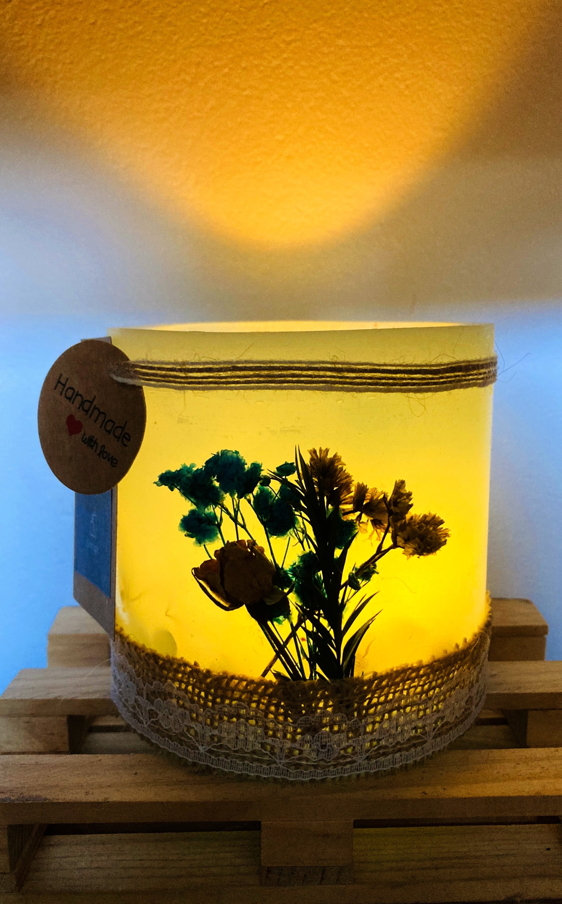 - Decoración: Hojas secas en interior y exterior, base con cuerda y encaje. Aroma: Floral. Uso: Compatible con luz LED o vela de té (recomendado añadir sal gorda o arena en la base al usar velas de té). Elaboración: 100% artesanal bajo la marca Lilinnight. Peso:285 gr