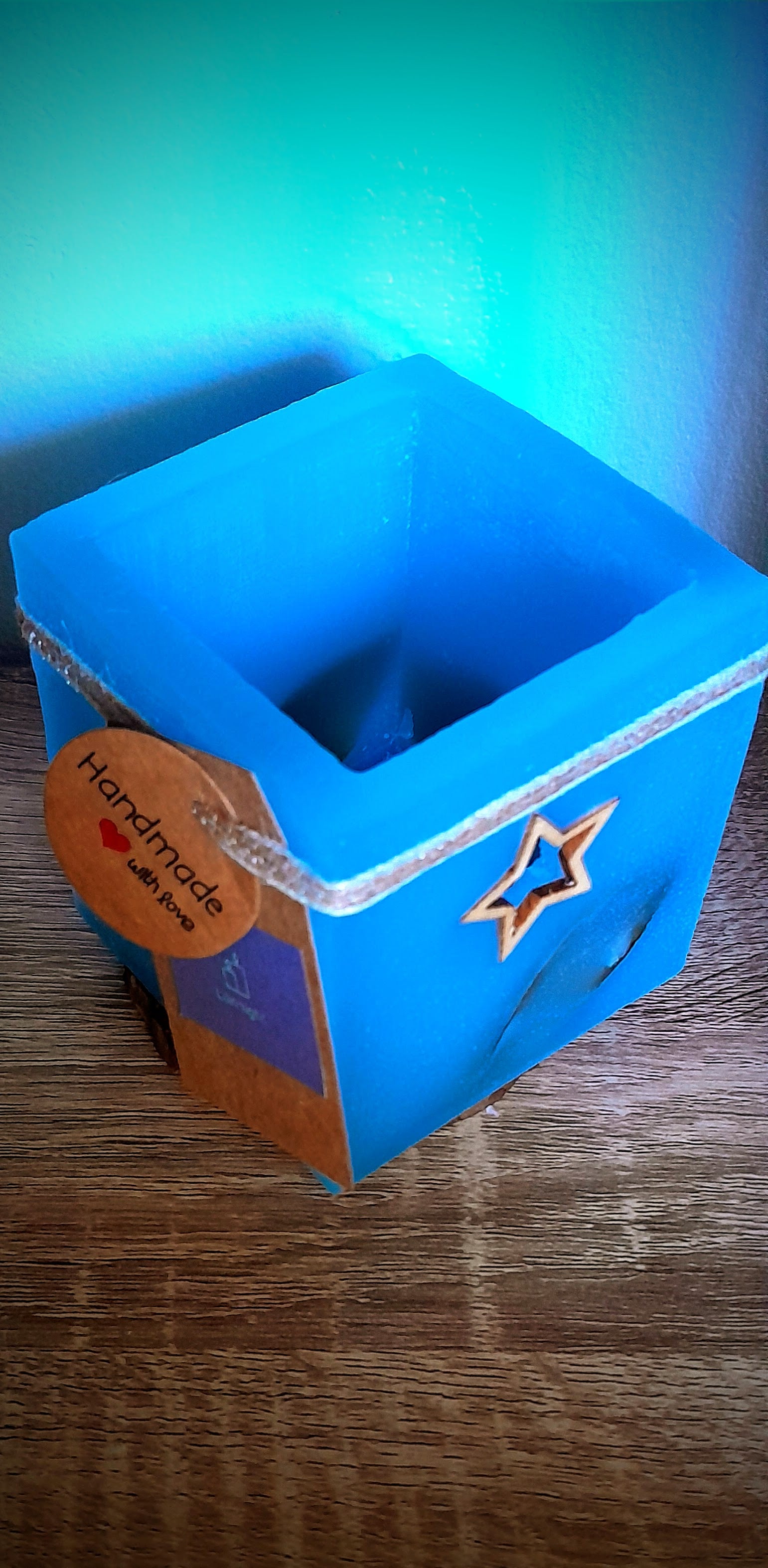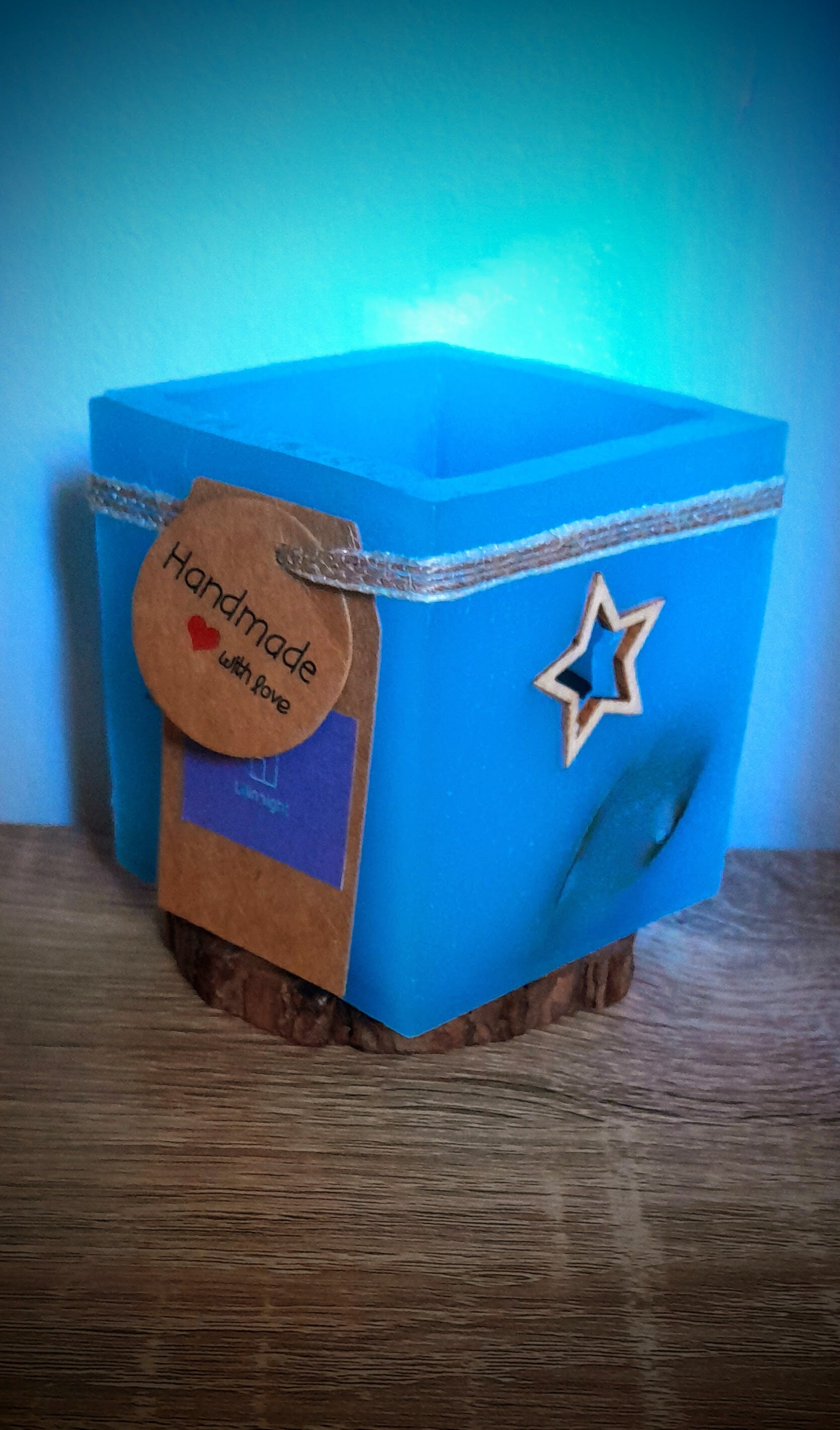 Este encantador fanal de cera artesanal de 8x8 cm es una pieza única que fusiona diseño, aroma y calidez. Con un delicado tono azul cielo, contiene hojas secas naturales en su interior y un aplique de madera en forma de estrella que deja pasar la luz de forma mágica. Su suave fragancia a plátano aporta un toque tropical y acogedor al ambiente.