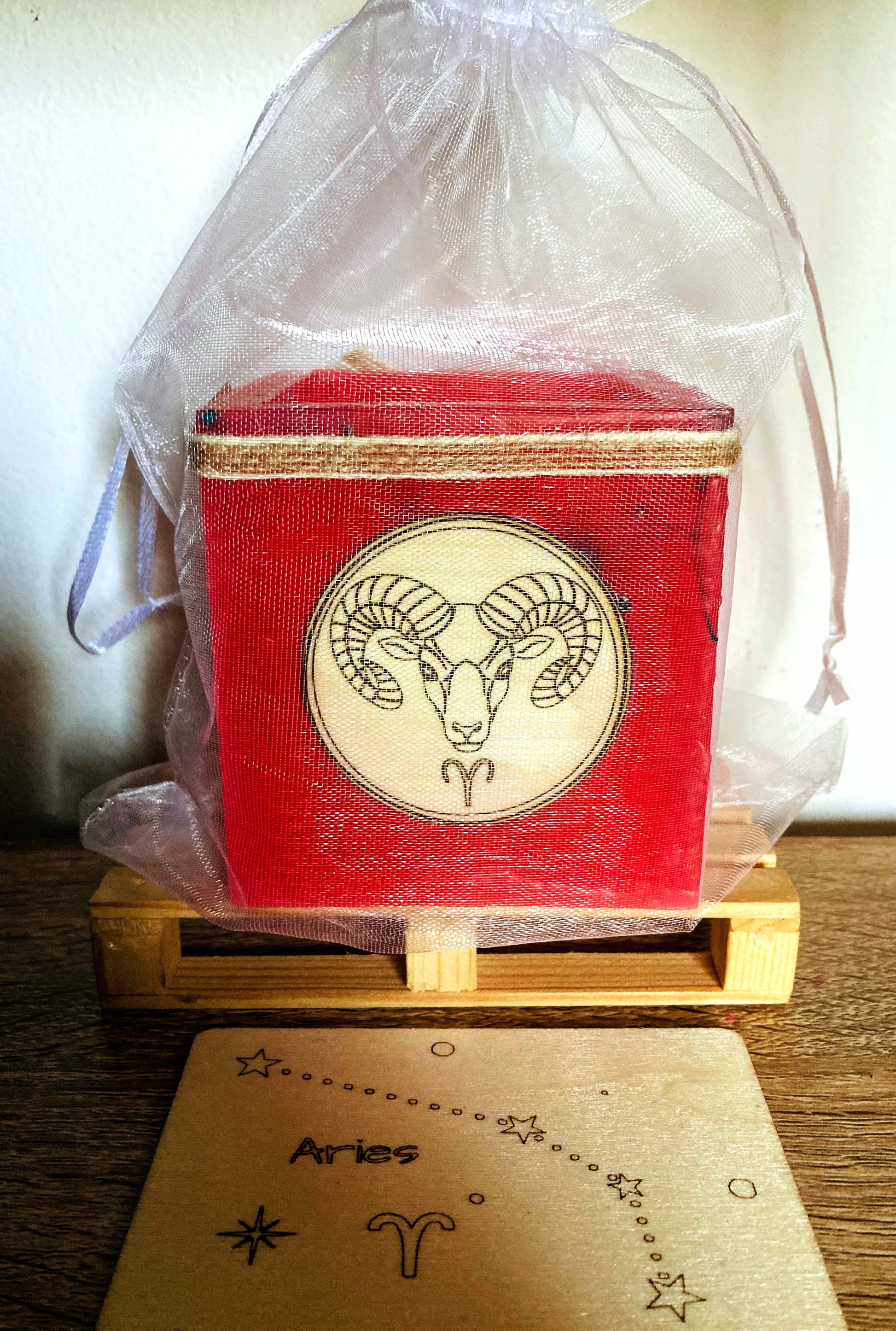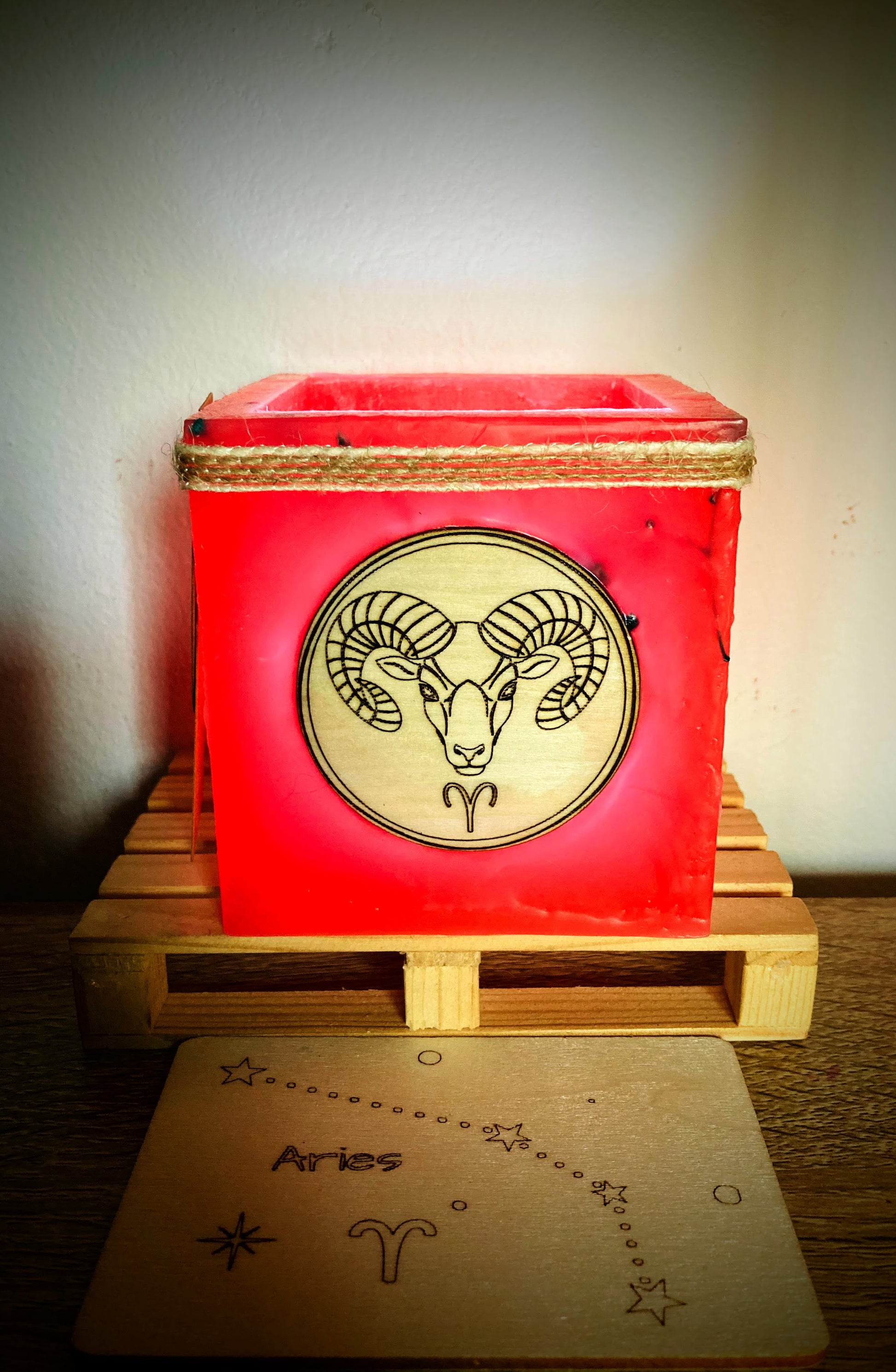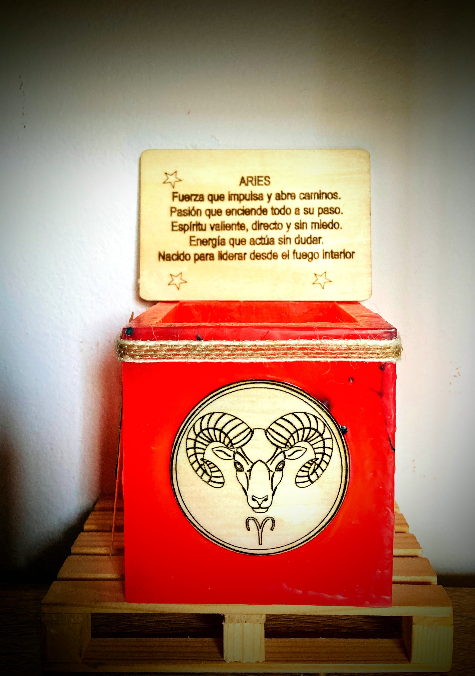 En su interior, flores naturales realzan su estética única. En la parte frontal, incorpora un aplique de madera grabado con una representación artística del carnero, símbolo de Aries. Se acompaña de una madera con la constelación y una descripción de las principales cualidades del signo, creando una pieza con significado y personalidad.