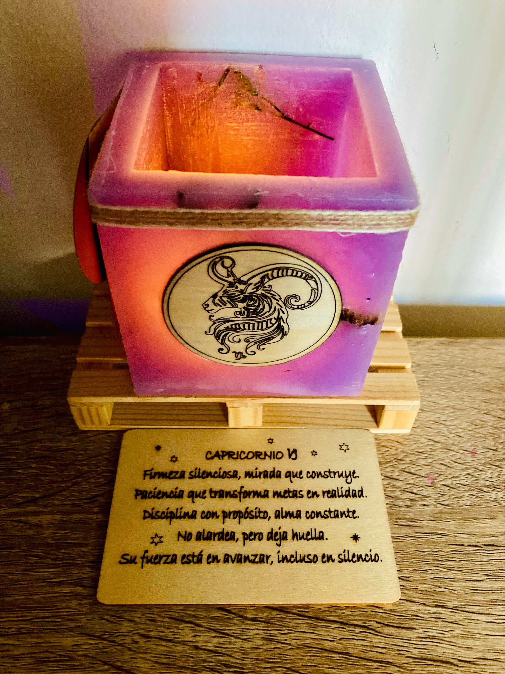 Este fanal hueco artesanal está dedicado al signo Capricornio, símbolo de disciplina, ambición y resistencia. Su color morado refleja profundidad y sabiduría, mientras que el aroma a frutos del bosque aporta una fragancia intensa y envolvente, ideal para crear un ambiente acogedor y equilibrado.