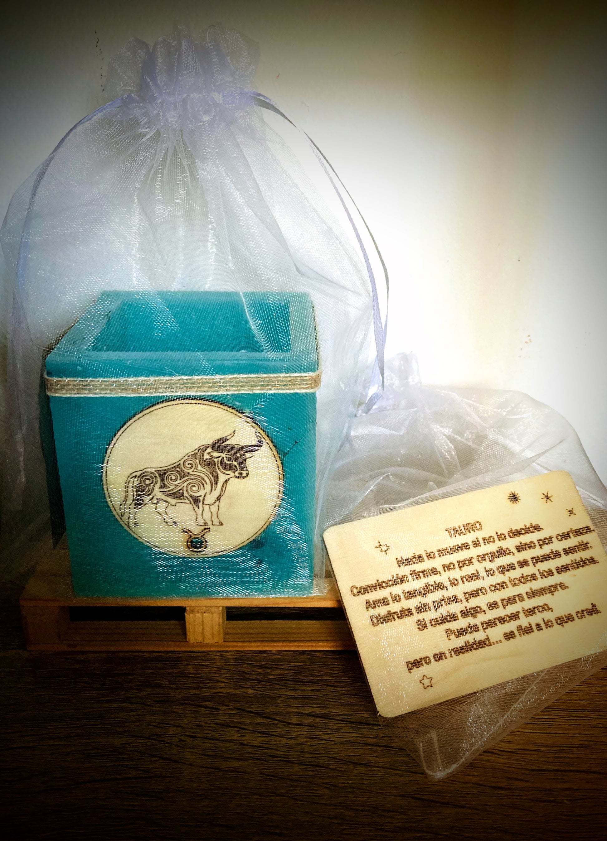 En el frente, el fanal lleva un aplique de madera grabado con la figura del toro, símbolo del signo, representado en un diseño artístico. En su interior, flores naturales encapsuladas aportan belleza, textura y un acabado único y artesanal.