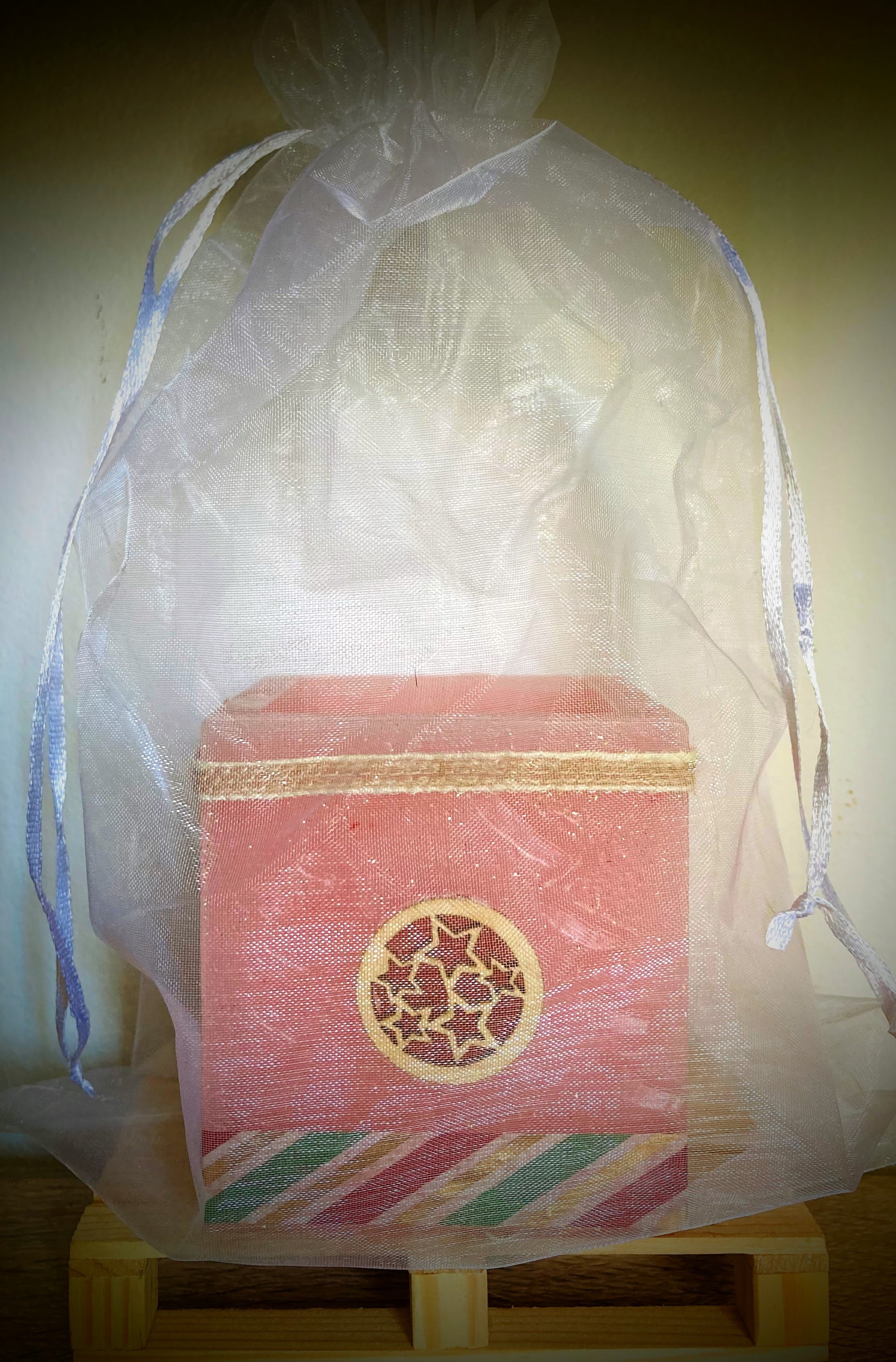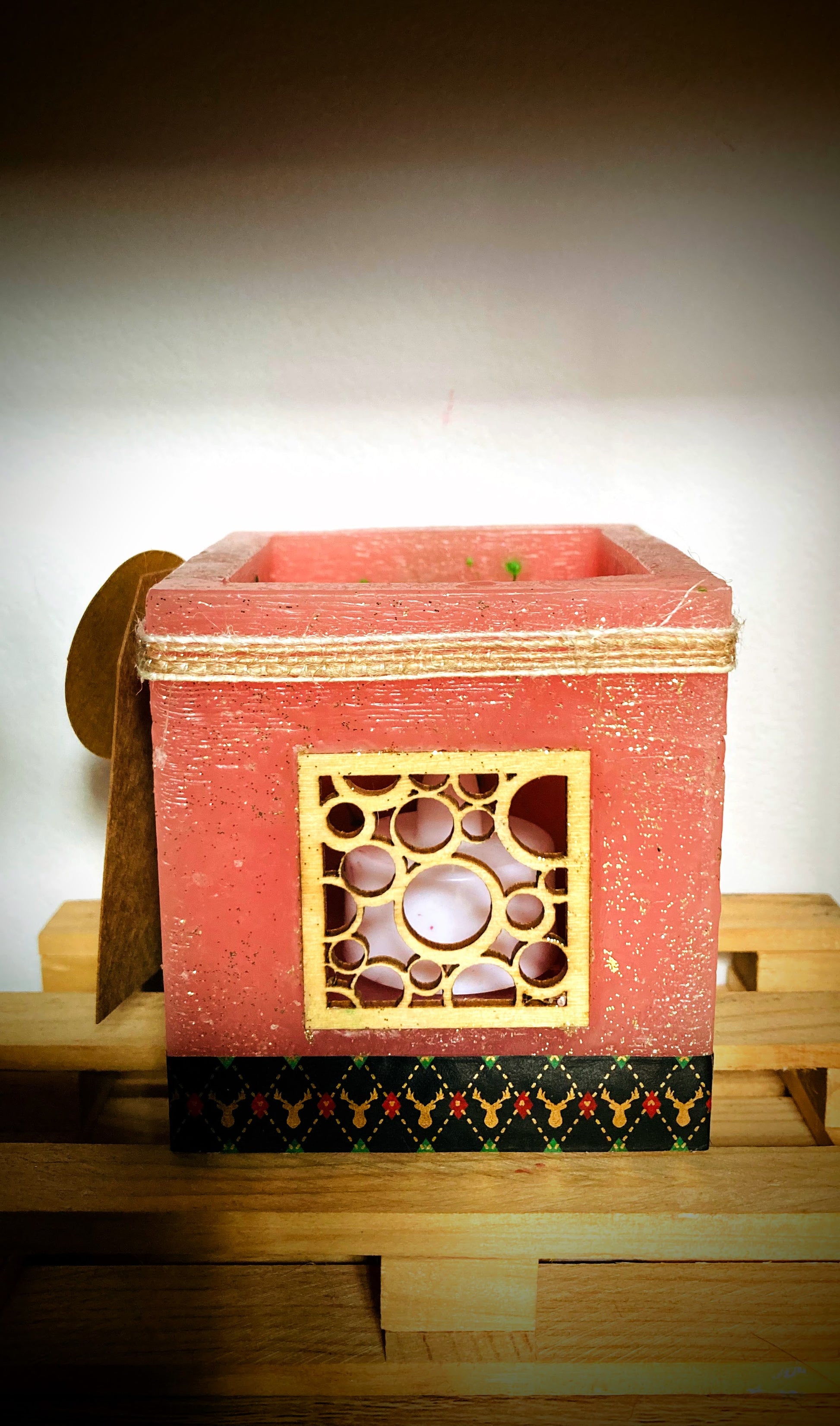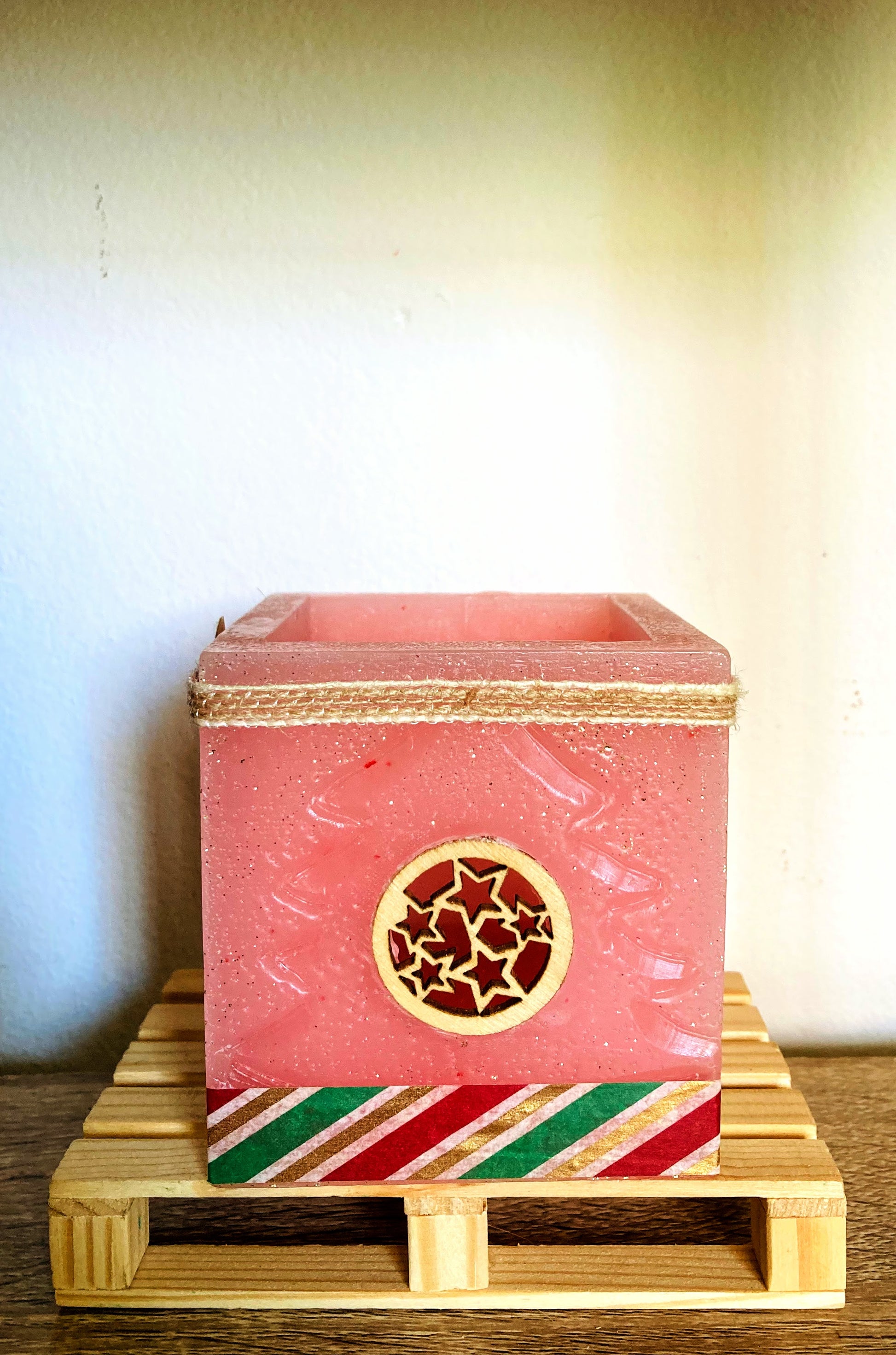 Delicadas, aromáticas y llenas de encanto, estas velas fanal artesanales en tono rosado están diseñadas para envolver tus espacios con calidez y un toque festivo. Ambas comparten un elegante color rosa con un sutil brillo de purpurina dorada y un suave aroma a rosas que invita a la tranquilidad y al bienestar.