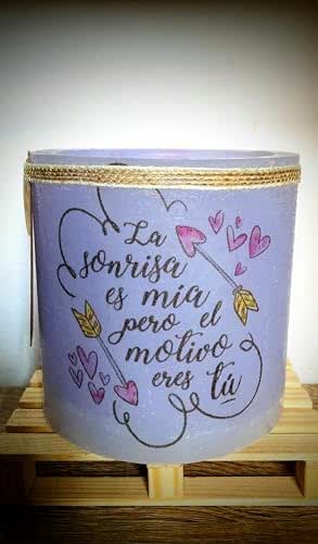 - Dimensiones: 10x10 cm Color: blanco azulado Diseño especial: Decorada con un mensaje romántico: "La sonrisa es mía, pero el motivo eres tú", realizado con la técnica de decoupage, acompañado de corazones y flechas ilustrados. Materiales decorativos: Cinta dorada brillante alrededor de la parte superior, que aporta un toque sofisticado. Aroma: Suave fragancia floral, ideal para cualquier ambiente. Iluminación compatible: Uso con luz LED o vela de té. Marca: Lilinnight. Ocasión: Edición especial para San Valentín.