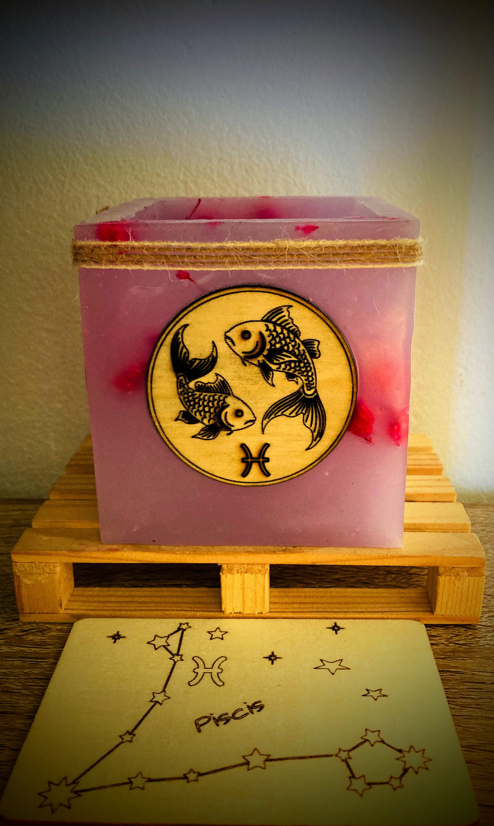 Sumérgete en la sensibilidad y el mundo interior de Piscis con este fanal hueco artesanal, hecho en cera con flores secas naturales y un delicado aroma a frutos del bosque. El diseño incorpora un aplique de madera con dos peces grabados —símbolo clásico del signo— que representan la dualidad y la profundidad emocional de Piscis.